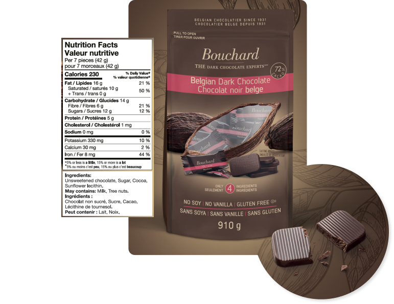 Bouchard is redefining the chocolate experience with our Dark 72% Napolitains. These delectable treats, actually made in Belgium, aren't just delicious – they're also nutritious. Perfect for those on vegan, keto, or diet-friendly journeys, these chocolate Naps have up to 50% less sugar than your average milk chocolate bar. Packed with natural antioxidants and boasting a mere 28 calories per pre-wrapped piece, they're a guilt-free indulgence you can enjoy on the go. Bouchard's individually wrapped Napolitains are the perfect way to elevate your chocolate cravings.